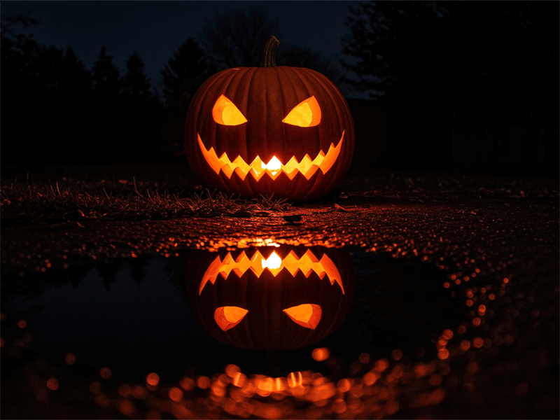 فانوس جاك المضاء ينعكس في بركة ماء في الليل مع خلفية داكنة في مكان خارجي