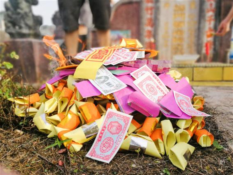 يقدم الصغار والكبار على حد سواء الصلوات أمام شواهد قبور الأجداد. ويحرقون ورق البخور، المعروف أيضاً باسم نقود الأرواح (صفائح من الخيزران أو ورق الأرز) وعيدان البخور، وينظفون القبور، ويقدمون الطعام والشاي والنبيذ وعيدان الطعام تخليداً لذكرى الأجداد.
